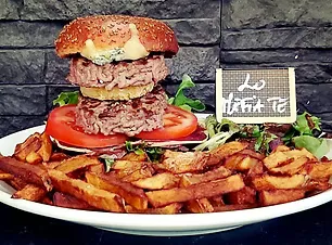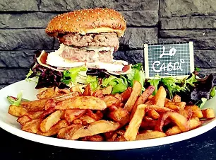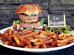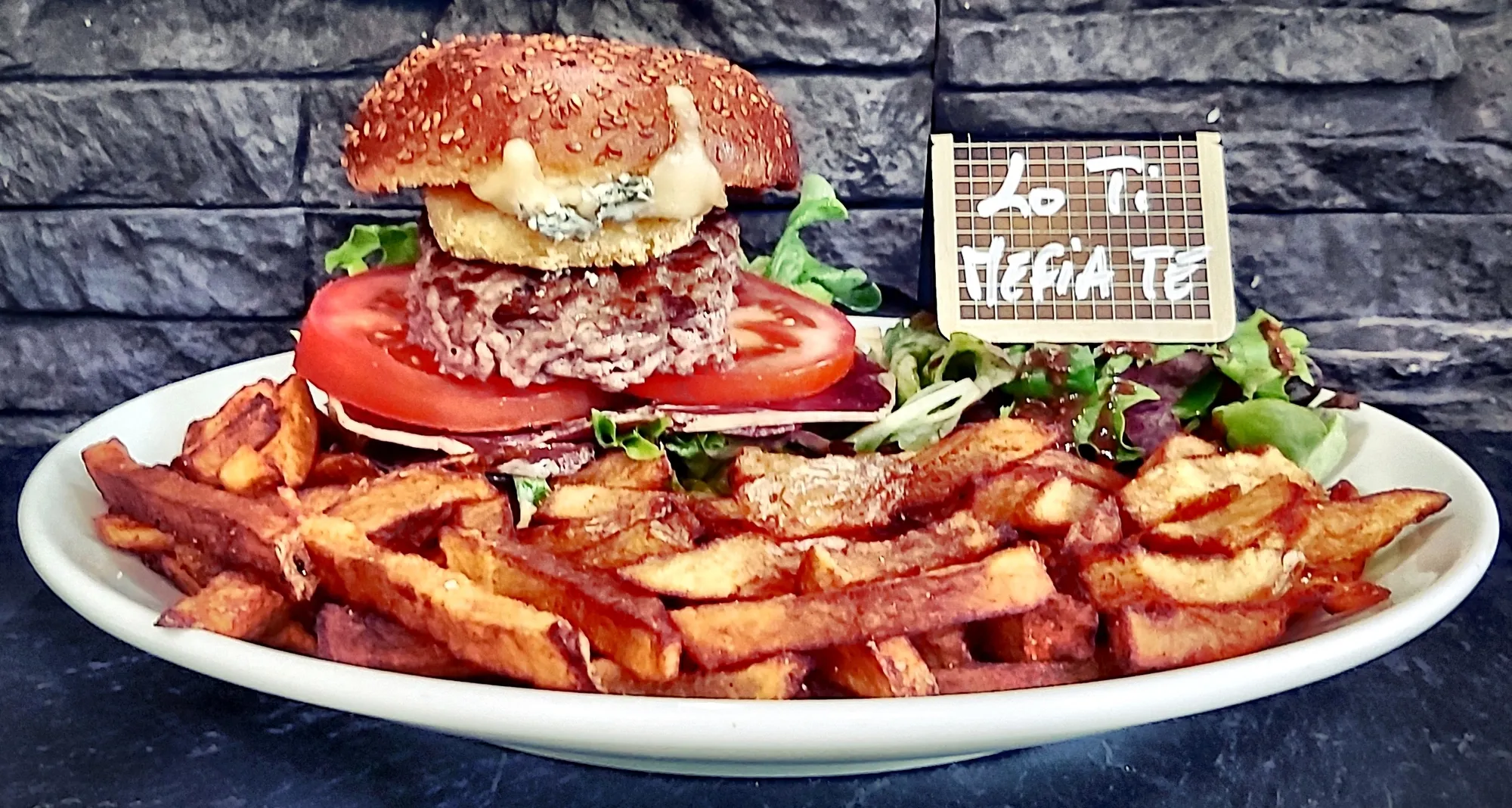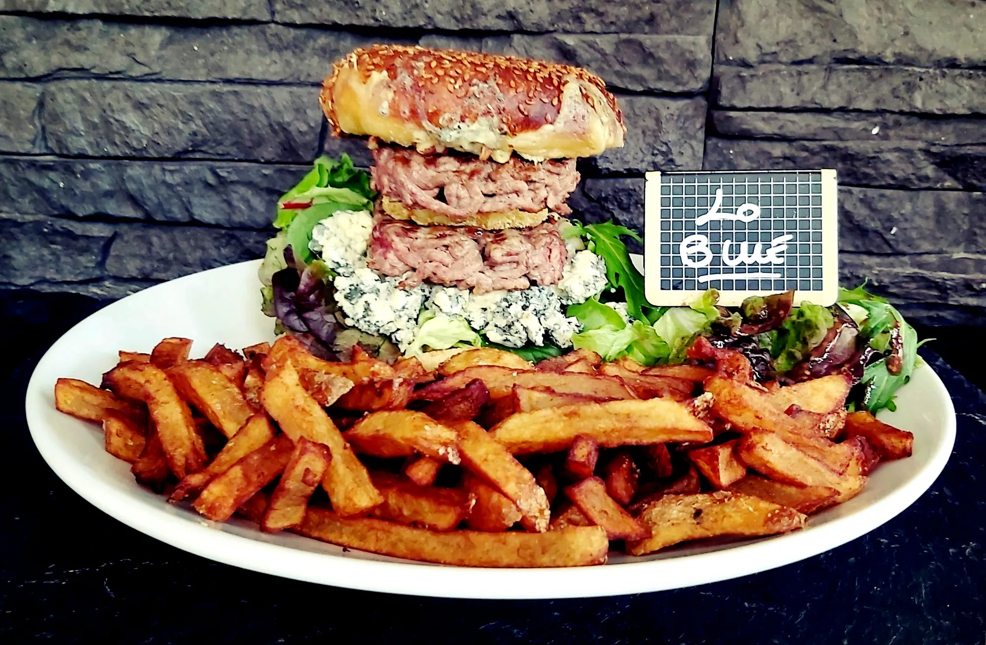 Burger Bun With Double Steak Burger, Auvergne Blue Cheese AOP, Mature Cantal Cheese AOP, Potato Pancake, Walnuts, Fresh Lettuce, Topped With An Auvergne Blue Cheese AOP Sauce.