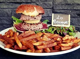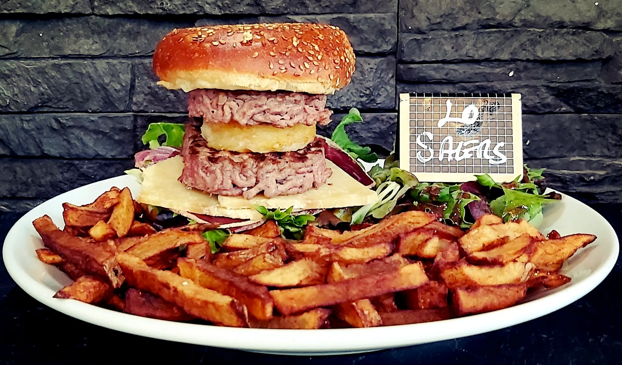 Burger Bun With Double Steak Burger, Cured Ham, Cantal Salers Cheese AOP, Potato Pancake, Fresh Lettuce, Topped With A Farmhouse St Nectaire Cheese AOP Sauce.