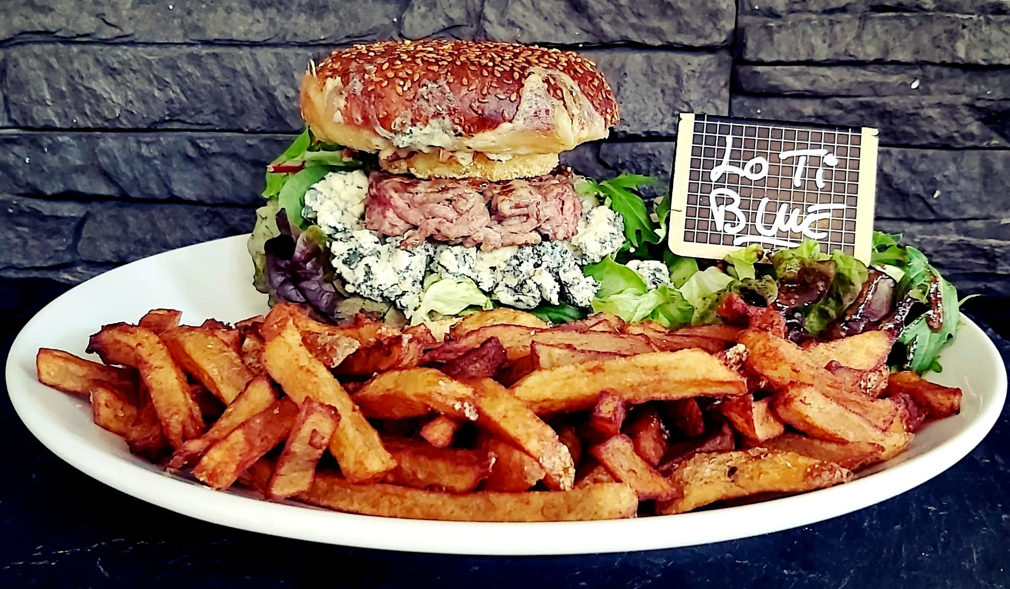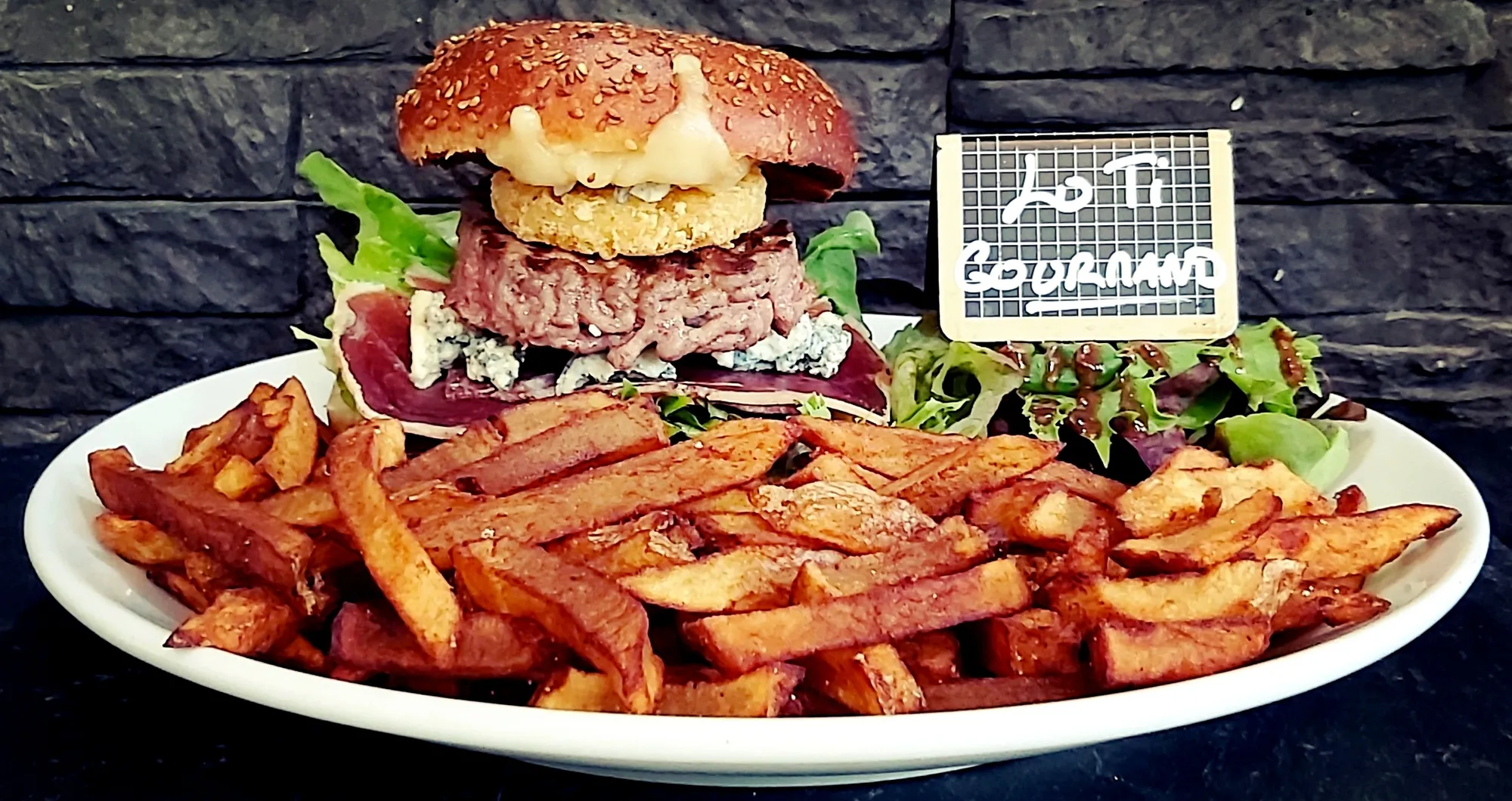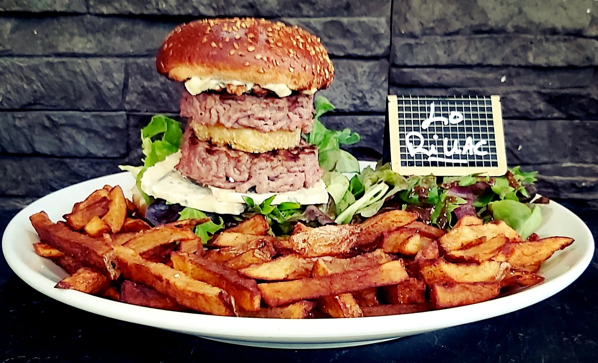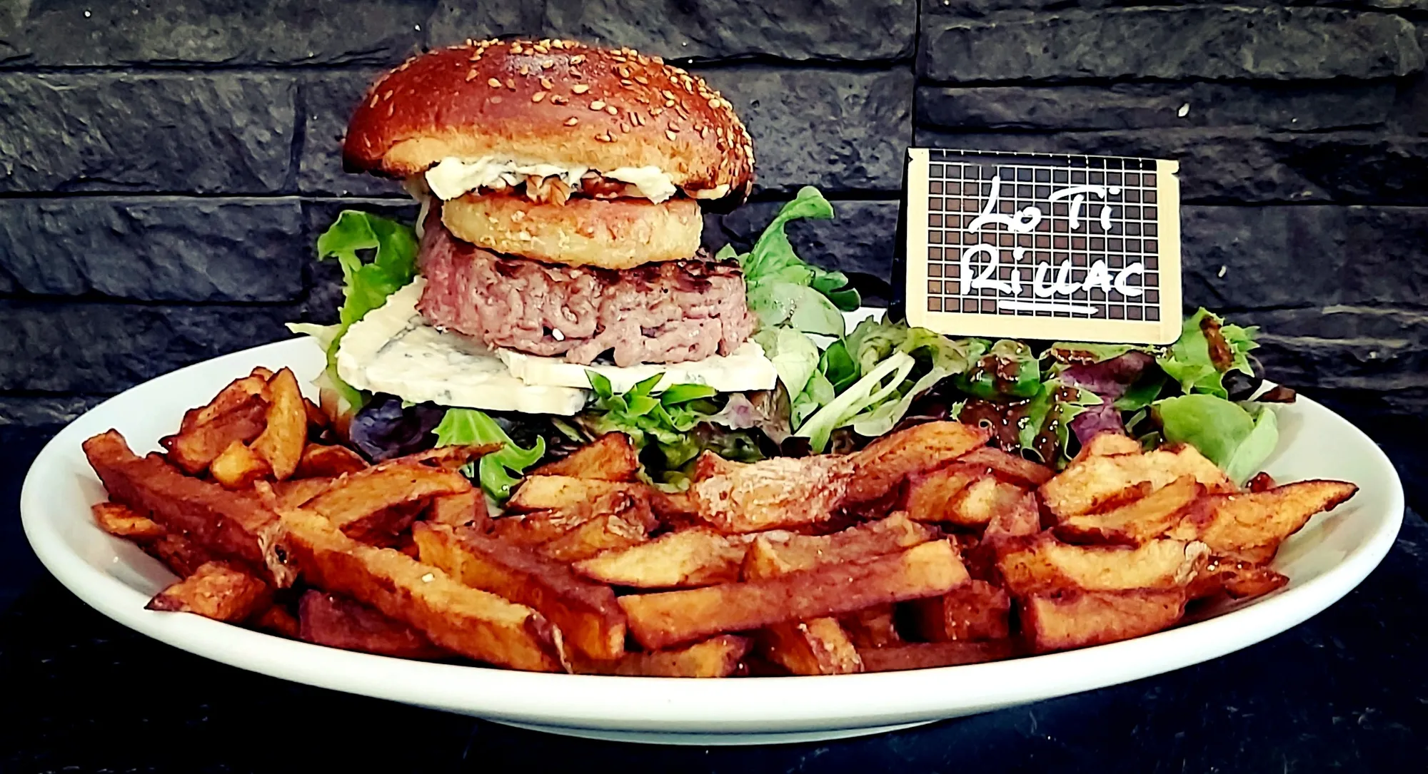Burger Bun With Double Steak Burger, Carré D’Aurillac Cheese AOP, Potato Pancake, Walnuts, Fresh Lettuce, Topped With An Auvergne Blue Cheese AOP Sauce.