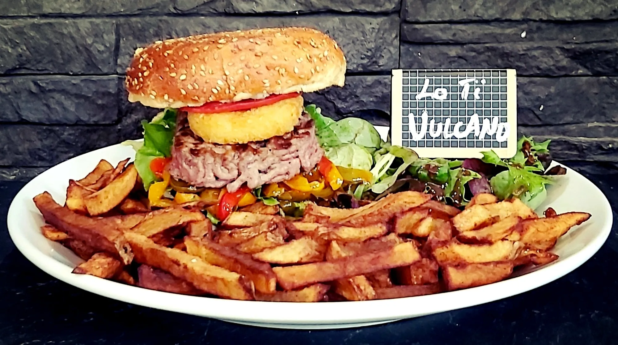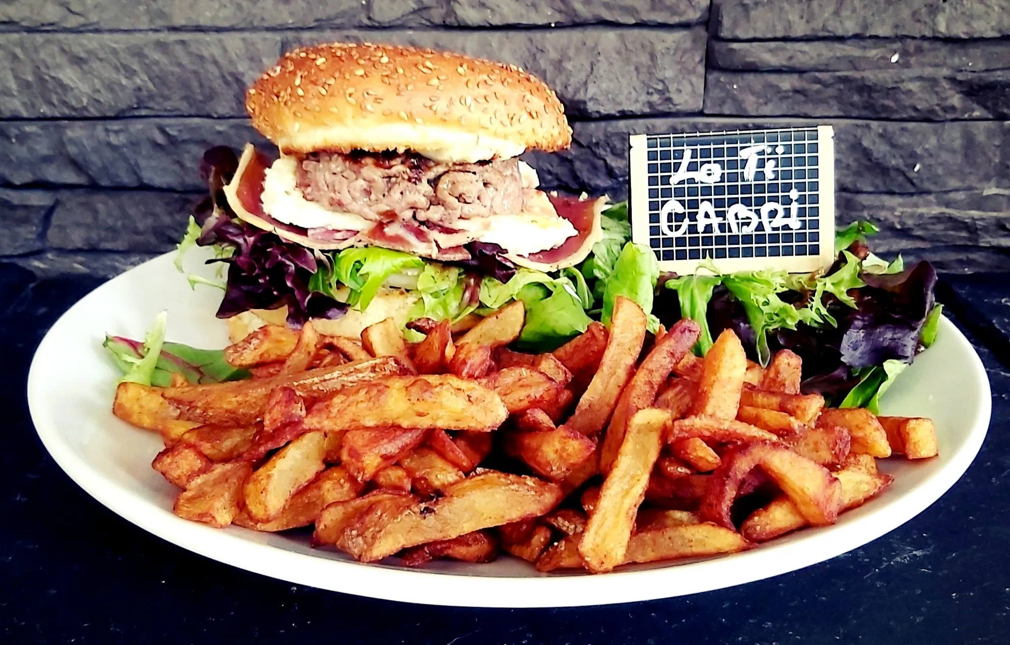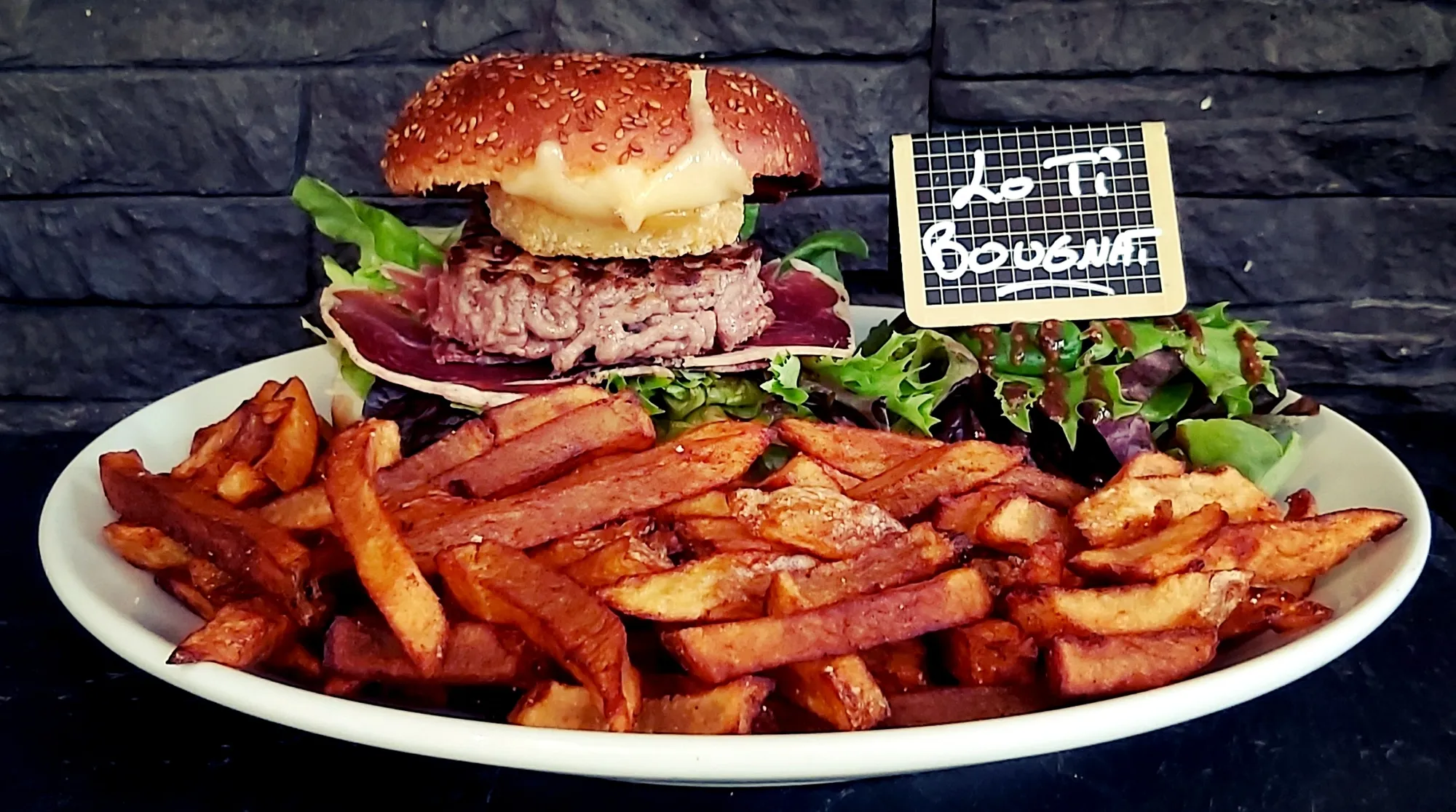 Burger Bun With Double Steak Burger, Cured Ham, Auvergne Blue Cheese AOP, Mature Cantal Cheese AOP, Tomatoes, Farmhouse St Nectaire Cheese AOP, Potato Pancake, Walnuts, Fresh Lettuce, Topped With A Farmhouse St Nectaire Cheese AOP Sauce.