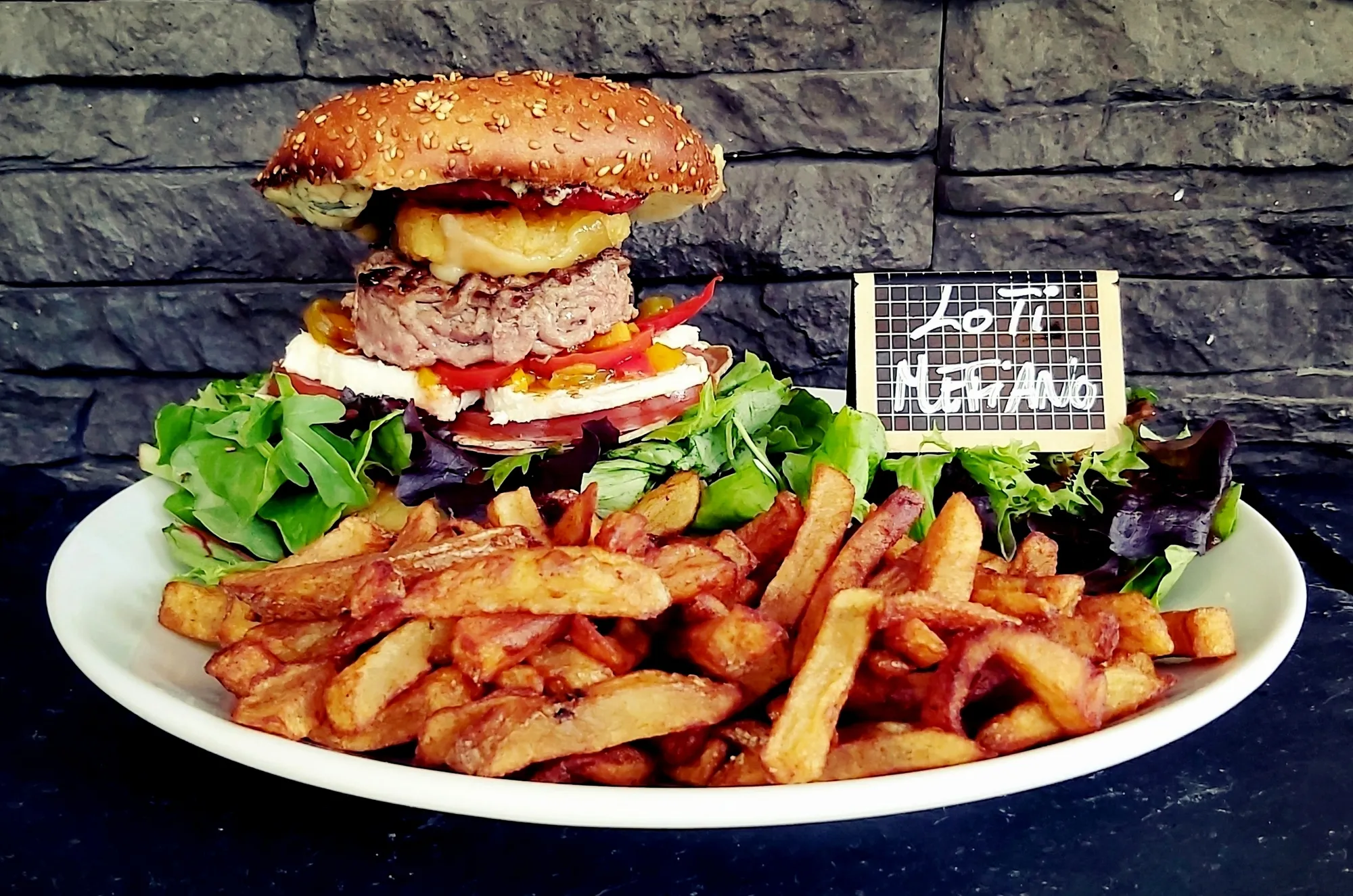Burger Bun With A Burger, Cured Ham, Auvergne Blue Cheese AOP, Mature Cantal AOP, Farmhouse St Nectaire Cheese AOP, Goats Cheese, Potato Pancake, Chorizo, Baked Peppers, Tomatoes, Walnuts, Fresh Lettuce, Topped With A Farmhouse St Nectaire Cheese AOP Sauce.