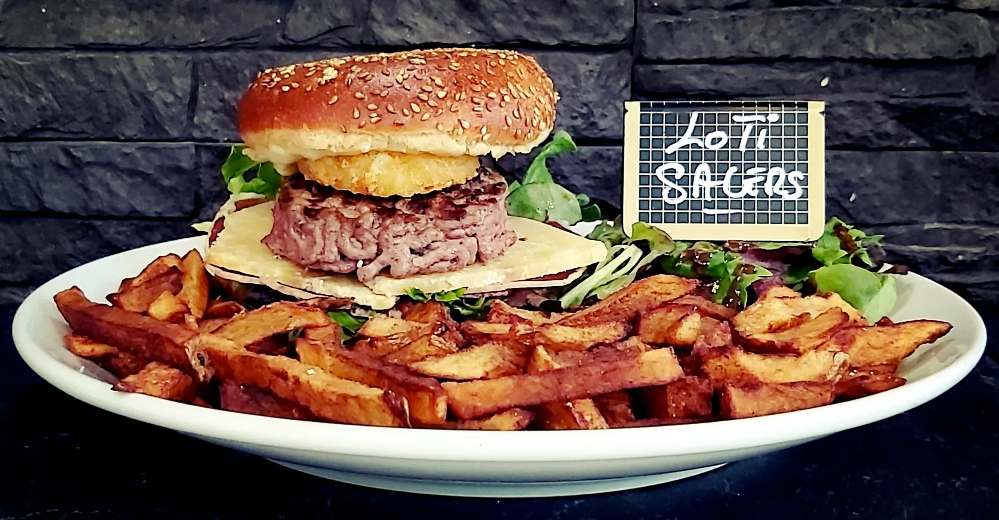 Burger Bun With A Burger, Cured Ham, Cantal Salers Cheese AOP, Potato Pancake, Fresh Lettuce, Topped With A Farmhouse St Nectaire Cheese AOP Sauce.