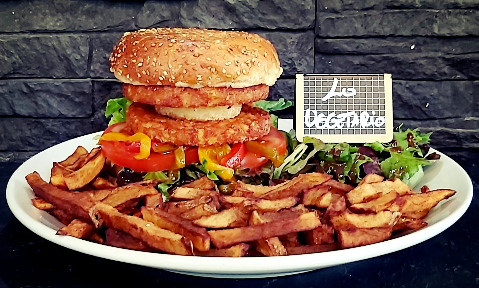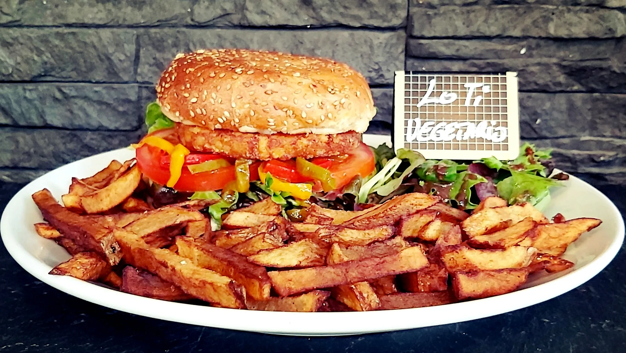 Burger Bun With A Thick Potato Pancake, Mature Cantal Cheese AOP, Peppers, Tomatoes, Fresh Lettuce, Topped With A Crème Fraiche And Chive Sauce.