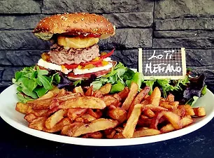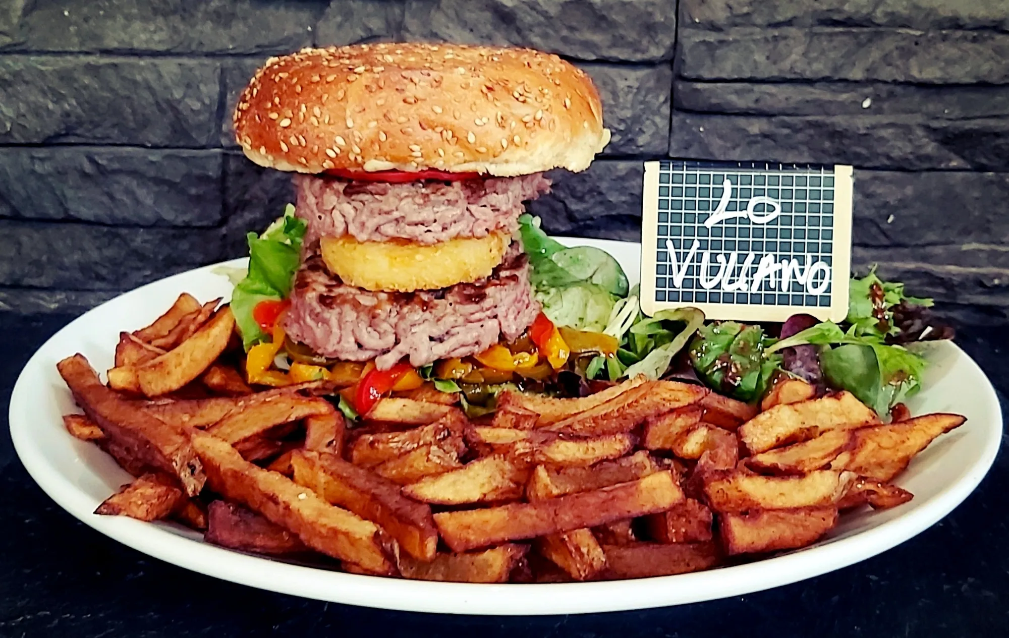 Burger Bun With Double Steak Burger, Cured Ham, Auvergne Blue Cheese AOP, Mature Cantal AOP, Farmhouse St Nectaire Cheese AOP, Goats Cheese, Potato Pancake, Chorizo, Baked Peppers, Tomatoes, Walnuts, Fresh Lettuce, Topped With A Farmhouse St Nectaire Cheese AOP Sauce.