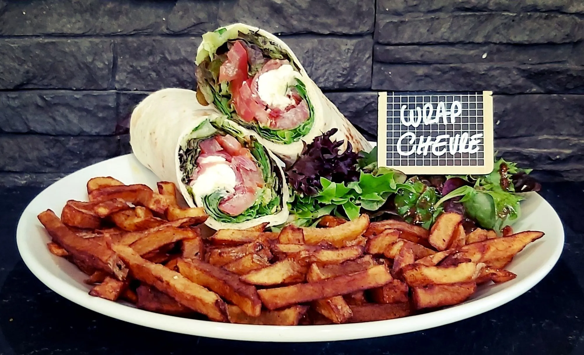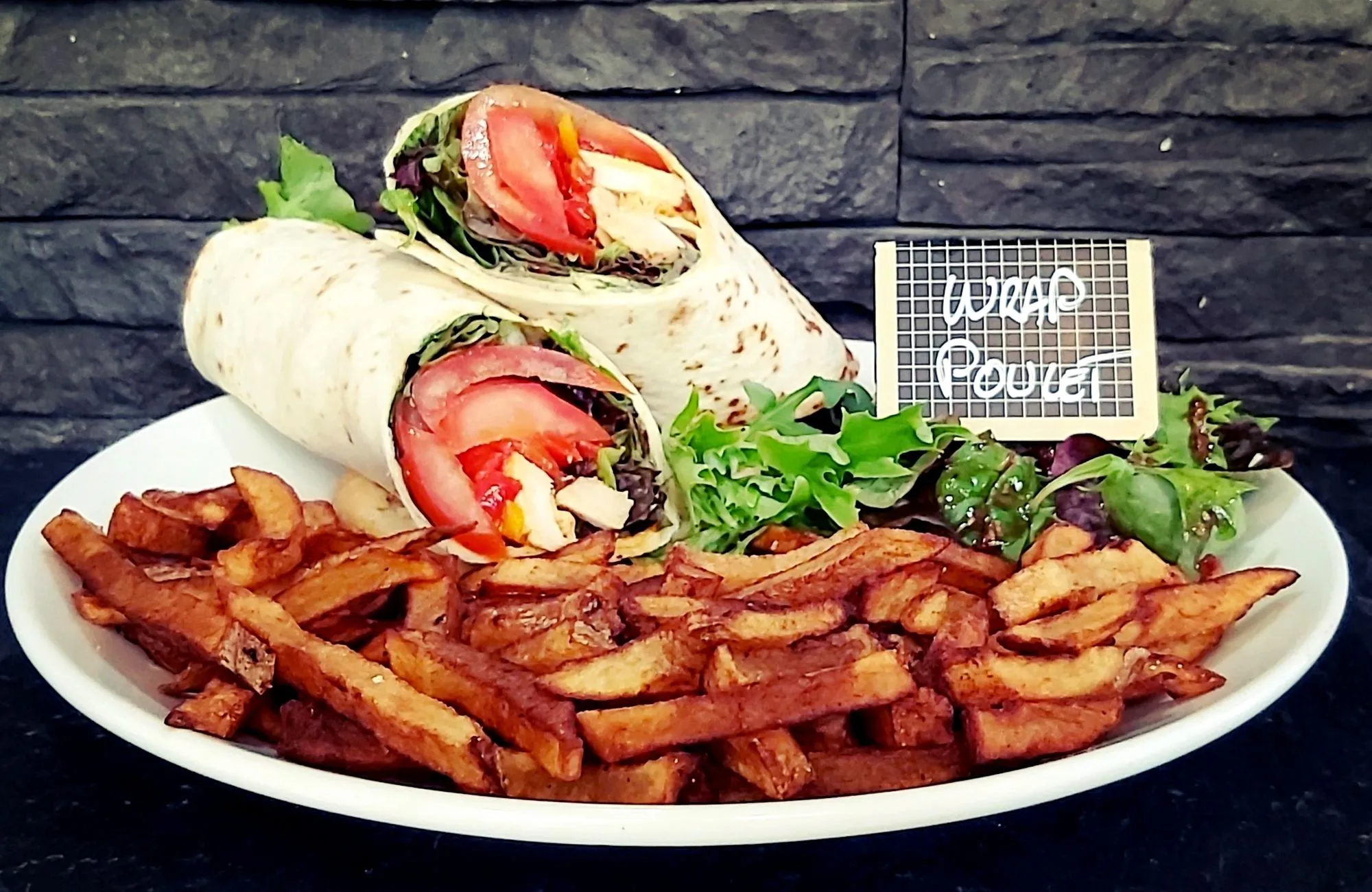Pancake, Chicken Slices, Fresh Salad, Tomato, Baked Peppers, Curry Cream Sauce.